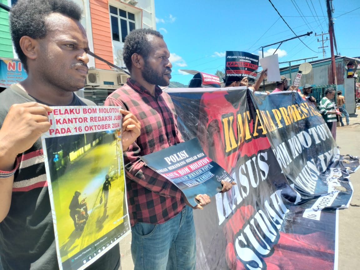 Koalisi dan Jurnalis mendesak Polda Papua segera ungkap pelaku pelempar bom molotov ke Kantor Jubi pada 16 Oktober 2024 lalu. – Tudepoint