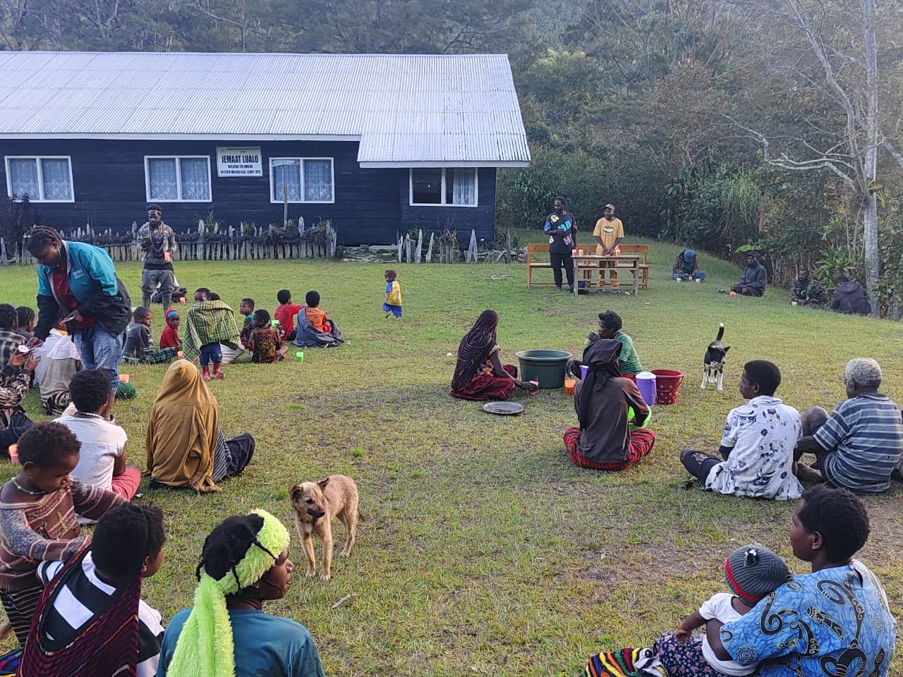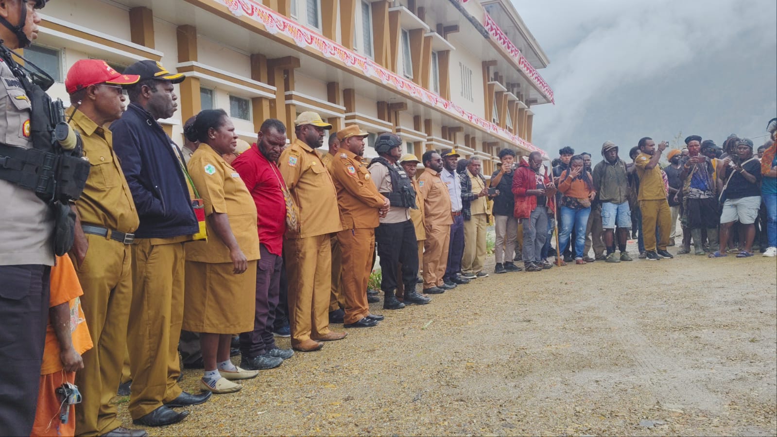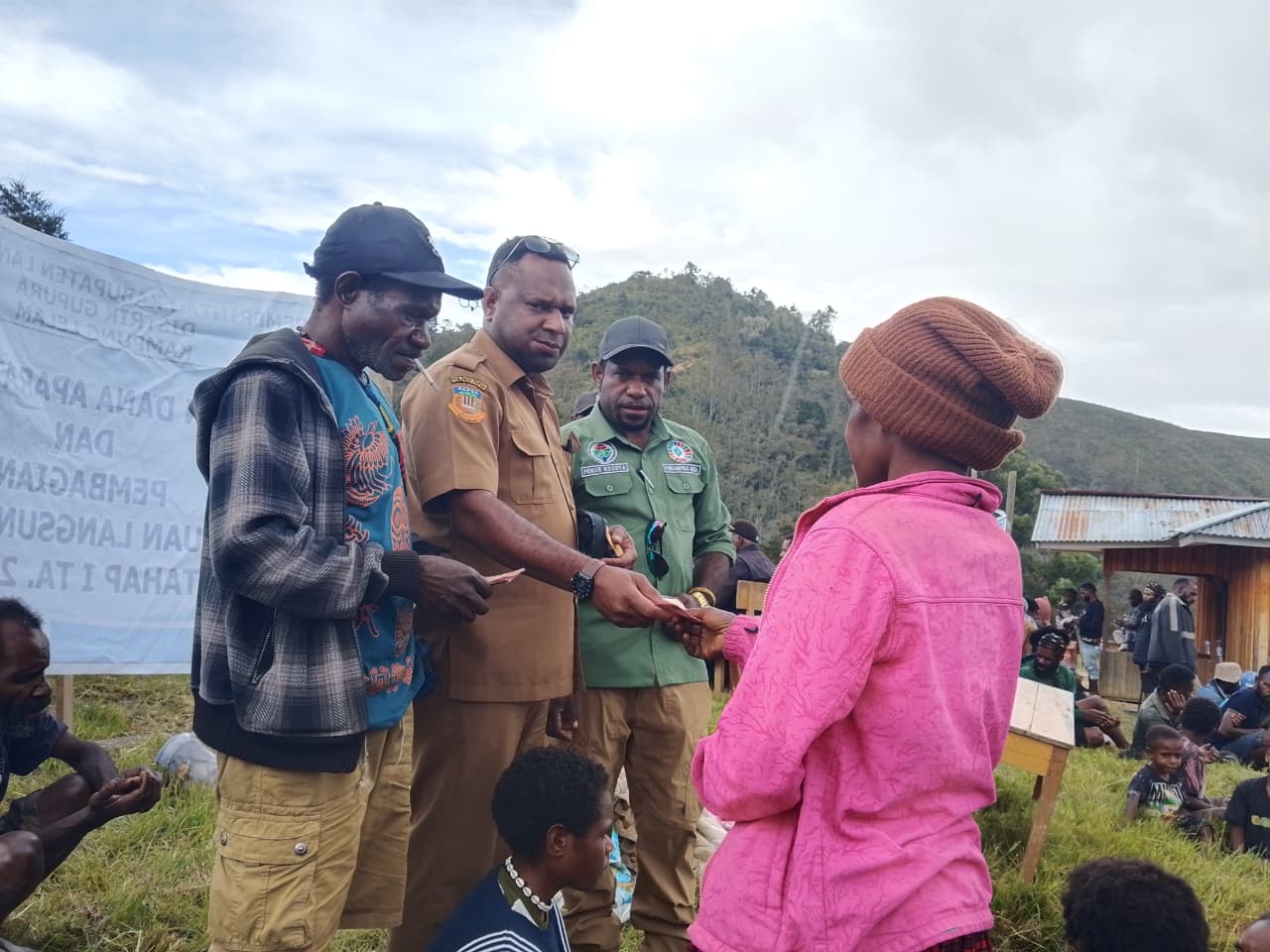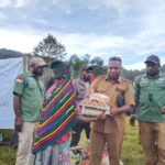 Warga antusias mengikuti proses penyerahan bantuan dari PLT Kepala Kampung, di halaman Kantor Distrik Muara, Kabupaten Jayawijaya.