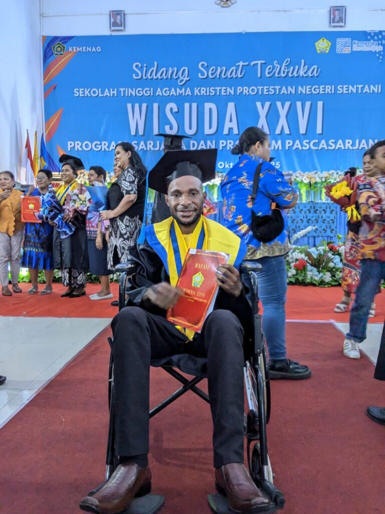 Sentani ( 31/10/2025) ,- Di tengah riuh tepuk tangan di aula wisuda Sekolah Tinggi Agama Kristen Protestan Negeri (STAKPN) Sentani, seorang pria berusia 30 tahun duduk di kursi rodanya dengan senyum menahan haru. Namanya Yustinus Mirip, mahasiswa asal Kabupaten Intan Jaya yang hari Jumat itu(31/10/2025), menerima ijazah dengan predikat Cumlaude — lulusan terbaik dari seluruh rekan seangkatannya.